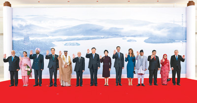 秋日漪園,水光瀲滟,丹桂飄香。習近平和彭麗媛熱情迎接貴賓,同他們親切握手并合影留念。
