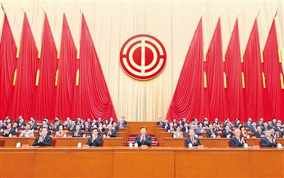 人民大會堂大禮堂氣氛熱烈。主席臺上方懸掛著“中國工會第十八次全國代表大會”的會標,后幕正中象征著中國工會和中國工人階級團結統(tǒng)一的工會會徽熠熠生輝,10面紅旗分列兩側。二樓眺臺懸掛著“堅持以習近平新時代中國特色社會主義思想為指導,全面貫徹黨的二十大精神,組織動員億萬職工為全面建設社會主義現(xiàn)代化國家、全面推進中華民族偉大復興團結奮斗!”的巨型橫幅。