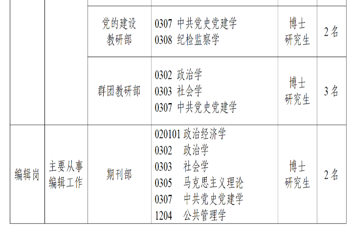 為進(jìn)一步加強(qiáng)校(院、室)人才隊(duì)伍建設(shè),根據(jù)教學(xué)科研和學(xué)科建設(shè)需要,按照《天津市事業(yè)單位公開(kāi)招聘人員實(shí)施辦法(試行)》(津人社局發(fā)〔2011〕10號(hào))、《市委組織部市人力社保局關(guān)于進(jìn)一步完善事業(yè)單位公開(kāi)招聘工作的通知》(津人社局發(fā)〔2017〕37號(hào))和《市委組織部市人力社保局關(guān)于進(jìn)一步做好事業(yè)單位公開(kāi)招聘高校畢業(yè)生等有關(guān)工作的通知》(津人社辦發(fā)〔2020〕100號(hào)),2024年,中共天津市委黨校(天津行政學(xué)院、中共天津市委黨史研究室)擬面向全國(guó)公開(kāi)招聘31名博士研究生人員?,F(xiàn)公告如下: