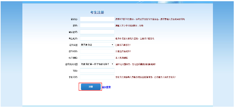 點(diǎn)擊“注冊”按鈕,進(jìn)入考生注冊頁面,如下圖所示: