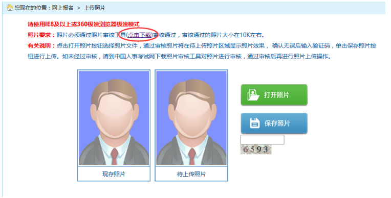 在考生登錄處進(jìn)行登錄,登錄成功后跳轉(zhuǎn)到上傳照片頁面,下載照片審核工具,如下圖所示: