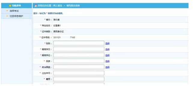 通過點(diǎn)擊接受按鈕,進(jìn)入考生填寫報名信息的頁面,如下圖所示: