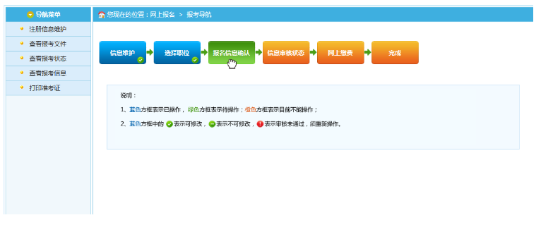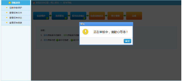 通過點(diǎn)擊“確認(rèn)”按鈕,提示確認(rèn)成功后跳轉(zhuǎn)到報考流程頁面。進(jìn)入審核狀態(tài),等待審核員進(jìn)行資格審核。