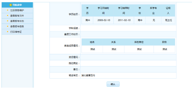 通過點(diǎn)擊“報名信息確認(rèn)”按鈕后,跳轉(zhuǎn)到報名信息確認(rèn)頁面,如下圖所示: