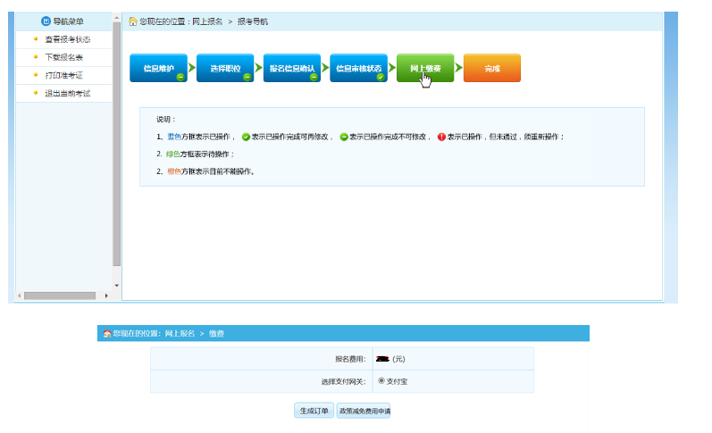 審核通過的考生可以進(jìn)行網(wǎng)上繳費(fèi),點(diǎn)擊報考流程中“網(wǎng)上繳費(fèi)”選項(xiàng),可以進(jìn)入網(wǎng)上繳費(fèi)的頁面,如下圖所示:
