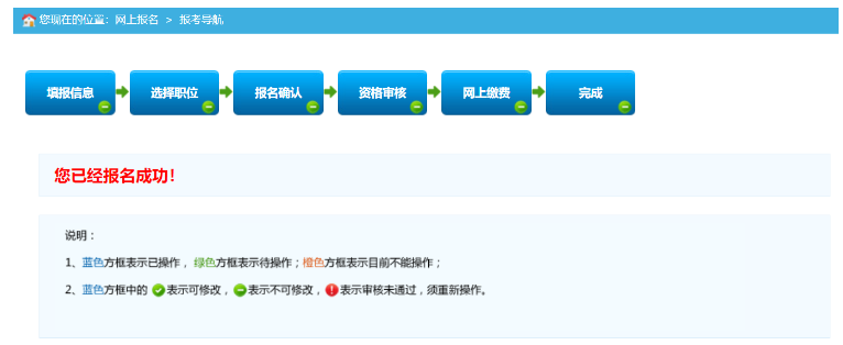 政策減免費(fèi)用審核通過后,報名流程中“完成”按鈕為藍(lán)色,代表申請“政策減免費(fèi)用”報名成功。