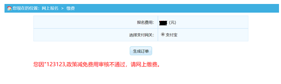 “網(wǎng)上繳費(fèi)”界面提示“您因XXXX政策減免費(fèi)用審核不通過,請網(wǎng)上繳費(fèi)”時,需重新生成訂單,進(jìn)行網(wǎng)上繳費(fèi)。
