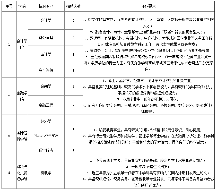常任軌教師:為學(xué)校高層次人才的預(yù)備培育“蓄水池”,面向海內(nèi)外優(yōu)秀青年才俊,專業(yè)為會計學(xué)、審計學(xué)、公司金融、數(shù)字金融、金融理財、綠色金融、國別金融、科技金融、宏觀經(jīng)濟(jì)、區(qū)域經(jīng)濟(jì)、數(shù)字經(jīng)濟(jì)、經(jīng)濟(jì)統(tǒng)計和建模等專業(yè),薪資待遇面議。