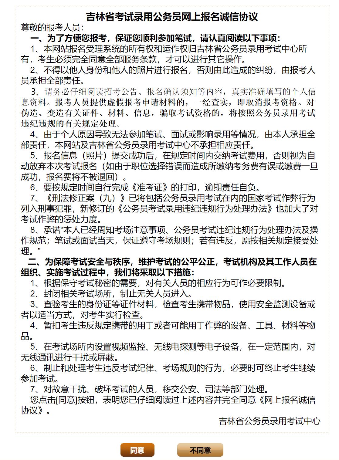 3、考生認(rèn)真閱讀‘吉林省考試錄用公務(wù)員考生誠信須知’(如圖1-3)后,點(diǎn)擊‘同意’即可進(jìn)入登錄及注冊頁面,如果點(diǎn)擊‘不同意’則返回到圖1-1頁面。