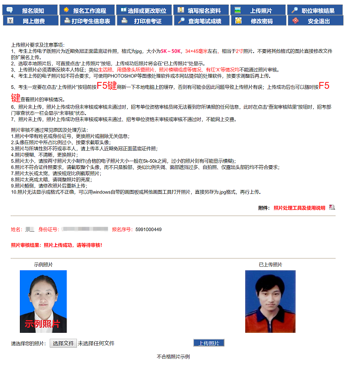 4、點(diǎn)擊‘上傳照片’按鈕,顯示‘已上傳照片,未審核,請等待審核!’如圖4-4,查看照片是否通過,可在圖4-4的頁面進(jìn)行查看??忌牲c(diǎn)擊“不合格照片示例”按鈕查看不符合要求的照片(僅做示例)。
