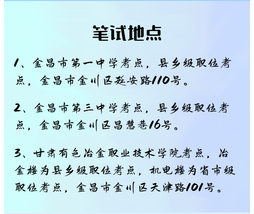 甘肅省2024年度考試錄用機關公務員和參照公務員法管理單位工作人員公共科目筆試將于2024年3月16日舉行,加試專業(yè)知識職位專業(yè)科目筆試于2024年3月17日舉行,為方便金昌考區(qū)考生做好應考工作,現(xiàn)將筆試期間有關事項公告如下: