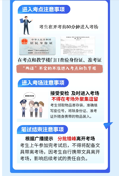 ?。ㄋ模┛忌陂_考前50分鐘須攜帶紙質準考證和有效居民身份證原件或臨時居民身份證進入考點,兩證不全者不得進入考點考場。本次筆試公安部門出具的帶有本人照片的“戶籍證明”不視為有效身份證件。