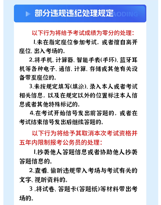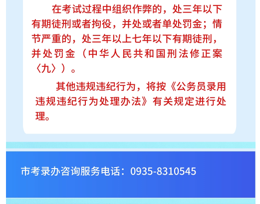 ?。ㄊ┛忌氄J真閱讀筆試有關規(guī)定,遵守考場規(guī)則,服從考務人員管理,接受監(jiān)考人員的監(jiān)督和檢查。對有作弊行為、無理取鬧、不配合考務人員進行相關詢問等造成嚴重后果的,或威脅、侮辱、誹謗、誣陷工作人員或其他考生的,將按《公務員錄用違規(guī)違紀行為處理辦法》等相關規(guī)定嚴肅處理。替考、電子作弊等違反《中華人民共和國刑法修正案(九)》等法律法規(guī)構成犯罪的,依法追究刑事責任。