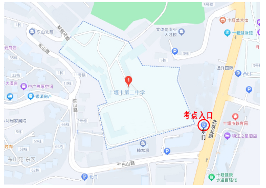 考點入口:北京北路十堰市第二中學(xué)門口(學(xué)校東門,十堰市教育局對面)。