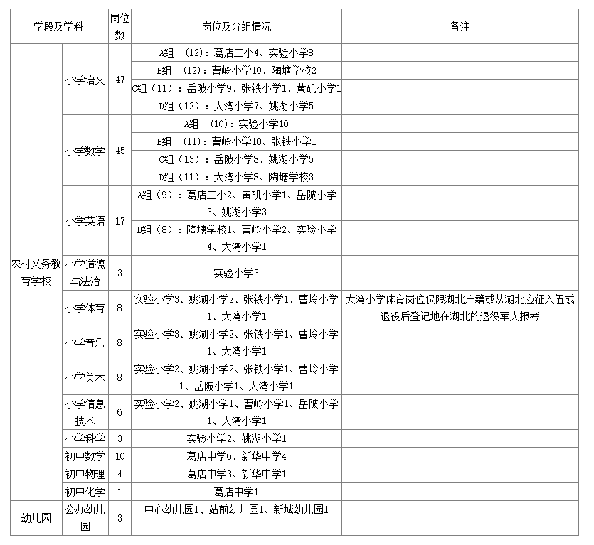 ?。?)崗位設(shè)置:葛店經(jīng)開(kāi)區(qū)大灣小學(xué)體育崗位(1個(gè));