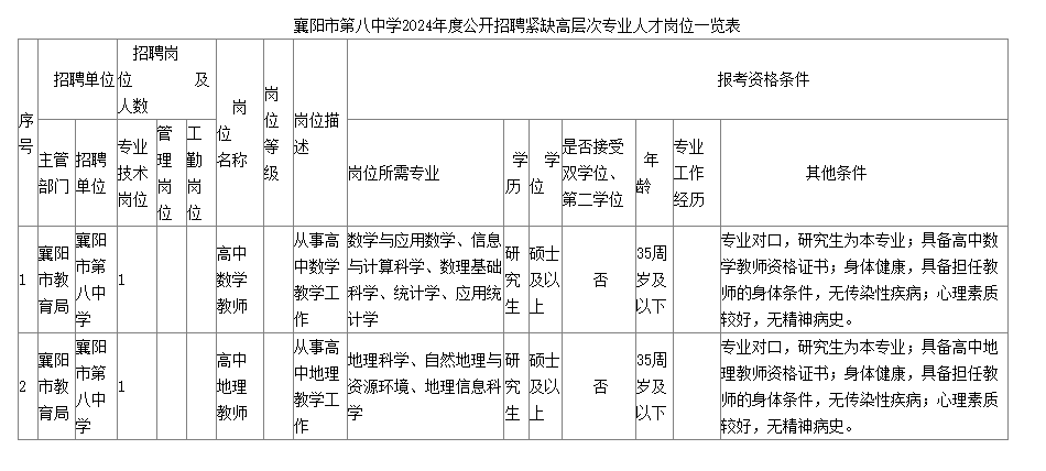 (一)襄陽(yáng)市第八中學(xué)擬公開(kāi)招聘緊缺高層次專業(yè)人才 2名。崗位條件詳情見(jiàn)《襄陽(yáng)市第八中學(xué)2024年度公開(kāi)招聘緊缺高層次專業(yè)人才崗位一覽表》。