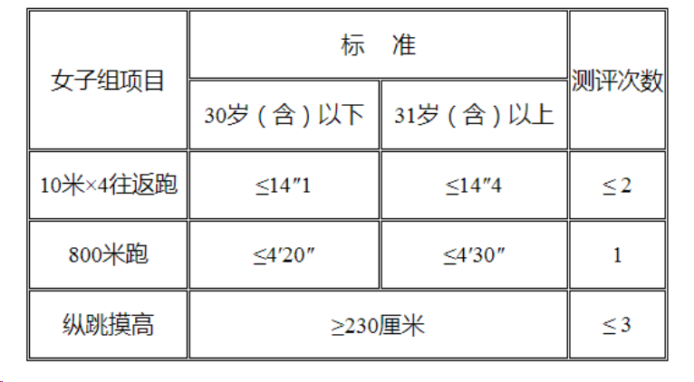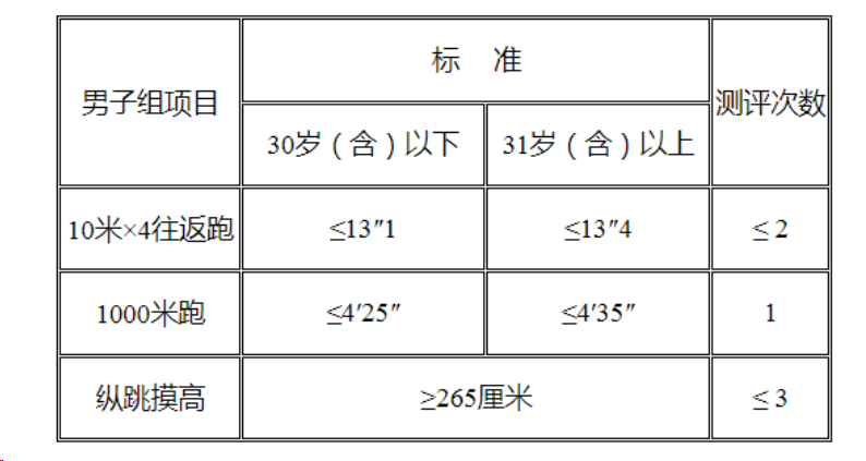 需要說明的是:年齡計算時截止到參加體能測評當月,即1993年4月(含)以后出生的考生體能測評按照30歲(含)以下的標準執(zhí)行,1993年3月(含)以前出生的考生體能測評標準按照31歲(含)以上的標準執(zhí)行。