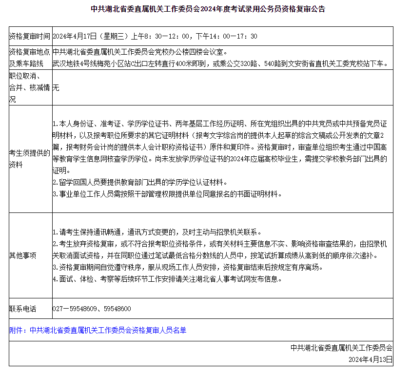 2024年中共湖北省委直屬機(jī)關(guān)工作委員會(huì)公務(wù)員考試資格復(fù)審公告