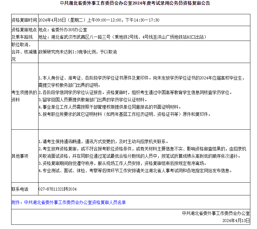 2024年中共湖北省委外事工作委員會辦公室公務(wù)員考試資格復(fù)審公告