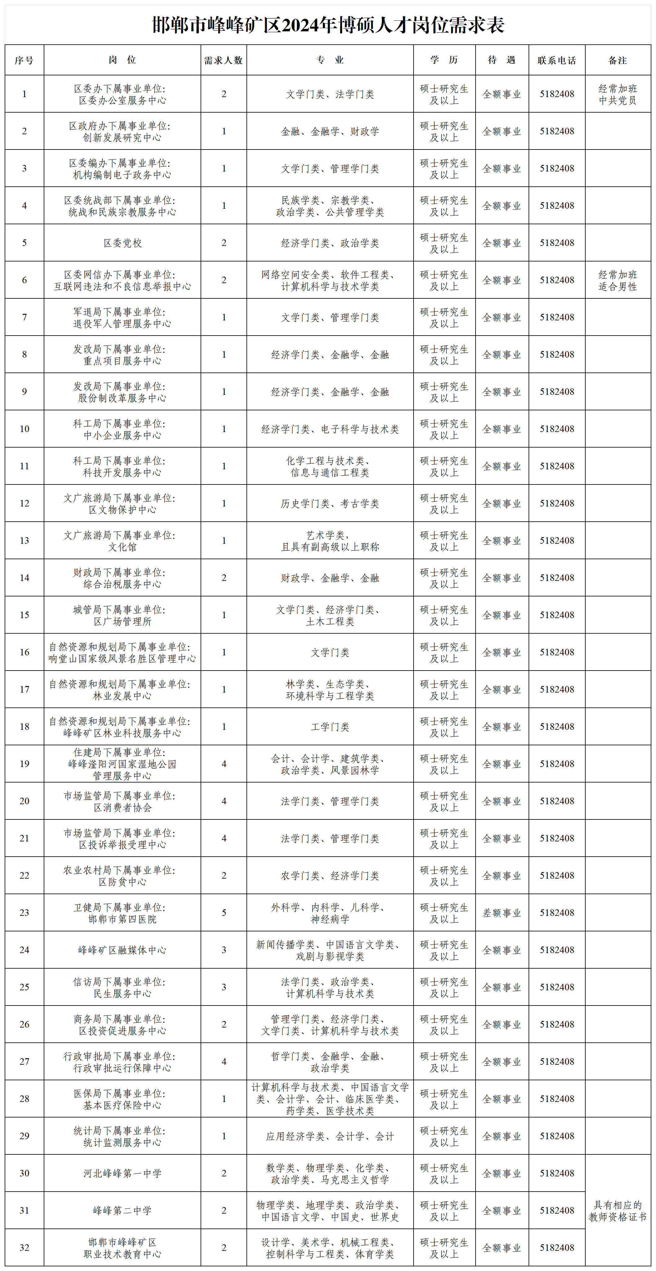 本次區(qū)屬事業(yè)單位共引進博碩人才61名,工作崗位詳見附表《邯鄲市峰峰礦區(qū)2024年博碩人才崗位需求表》。