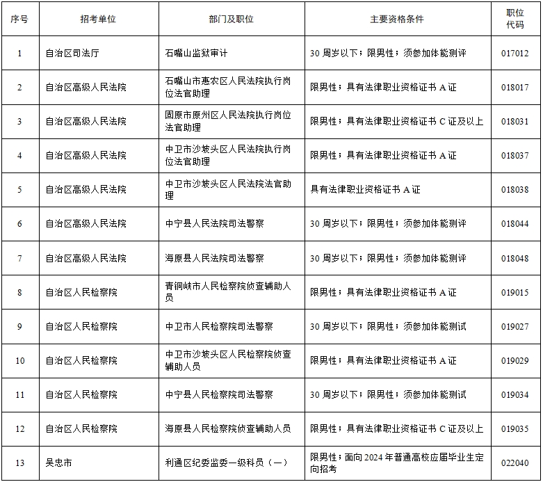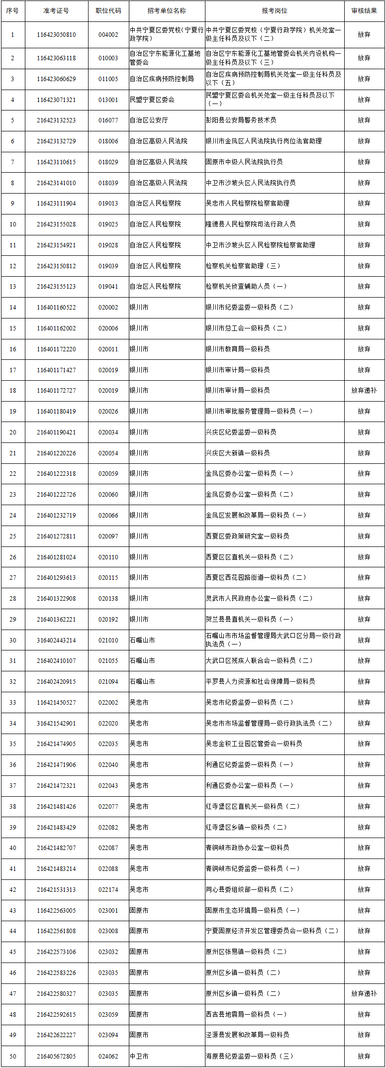 根據(jù)《寧夏回族自治區(qū)2024年考試錄用公務員公告》相關規(guī)定,自治區(qū)公務員局會同有關部門及各招錄機關對2024年全區(qū)考試錄用公務員擬進入面試的報考者進行了資格復審。復審中發(fā)現(xiàn),部分報考者不符合職位資格條件,部分報考者放棄面試資格,個別職位達不到面試開考比例。經(jīng)自治區(qū)公務員主管部門研究,決定取消部分報考者面試資格,降低部分職位面試開考比例?,F(xiàn)將有關情況公告如下: