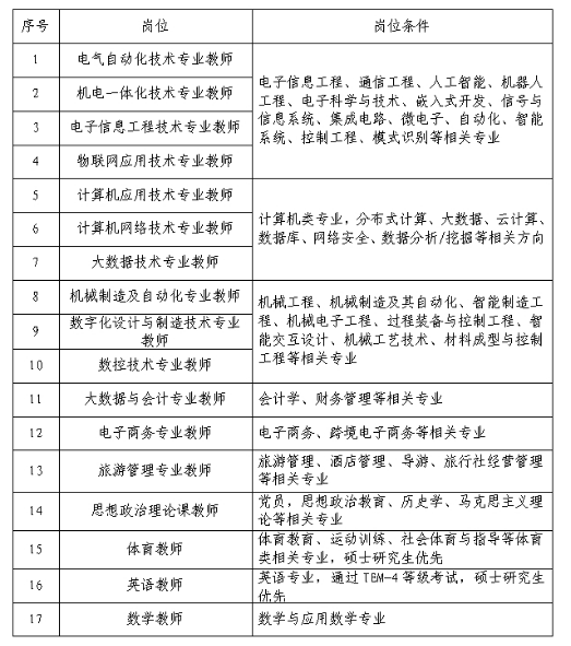 5.專任教師崗具有崗位所需專業(yè)或技能條件,具有高校教學(xué)經(jīng)驗(yàn)、中級(jí)以上專業(yè)技術(shù)職務(wù)或具有行業(yè)、企業(yè)工作經(jīng)歷優(yōu)先考慮,條件可適當(dāng)放寬;