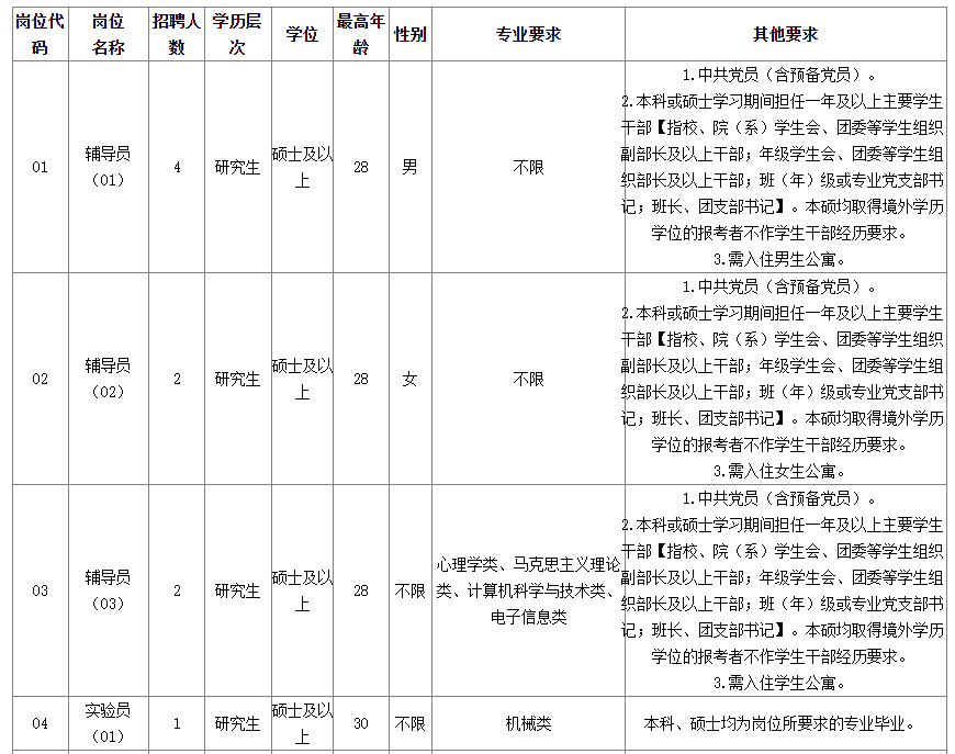 輔導(dǎo)員、財務(wù)工作人員、后勤專技人員等崗位考試采取筆試、面試相結(jié)合的辦法。實驗員崗位采取筆試、專業(yè)技能測試、面試相結(jié)合的辦法。