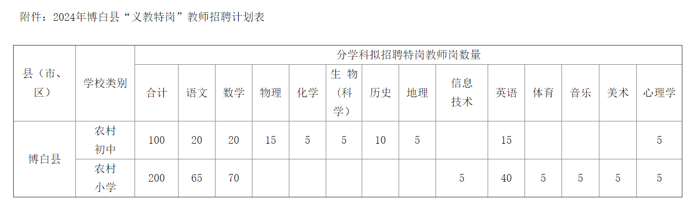 附件:1.2024年博白縣“義教特崗”教師招聘計劃表