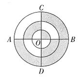 3.下圖中,三個(gè)同心圓的半徑分別為1厘米、2厘米、3厘米,AB與CD垂直且過(guò)圓心O。那么圖中陰影部分面積與非陰影部分的面積之比是多少( )
