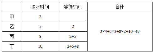 在排隊(duì)取水問題中,幾個(gè)人的取水時(shí)間是固定不變的,只需讓其等待時(shí)間最短即可。要使等待時(shí)間最短,就讓取水時(shí)間短的人先取水,從而確定幾個(gè)人的取水順序,再去計(jì)算時(shí)間。