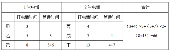 2.公用電話亭中有兩部電話,有甲、乙、丙、丁、戊、己6個(gè)人排隊(duì)打電話,打完即走,他們撥打電話時(shí)間分別為3分鐘、5分鐘、4分鐘、13分鐘、7分鐘、8分鐘,則大家在此公用電話亭逗留的總時(shí)間最少為多少分鐘( )?