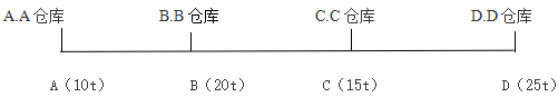 【答案】C【解析】當(dāng)支點(diǎn)位于AB中間時(shí),左邊的重量(10t)<右邊的重量(60t),因此支點(diǎn)往右移動(dòng),當(dāng)支點(diǎn)位于BC中間時(shí),左邊的重量(30t)<右邊的重量(40t),因此支點(diǎn)往右移動(dòng),當(dāng)支點(diǎn)位于CD中間時(shí),左邊的重量(45t)>右邊的重量(25t),因此支點(diǎn)往左移動(dòng),故為使得運(yùn)輸費(fèi)用最少,應(yīng)該把貨物集中到C倉庫。故本題選C。