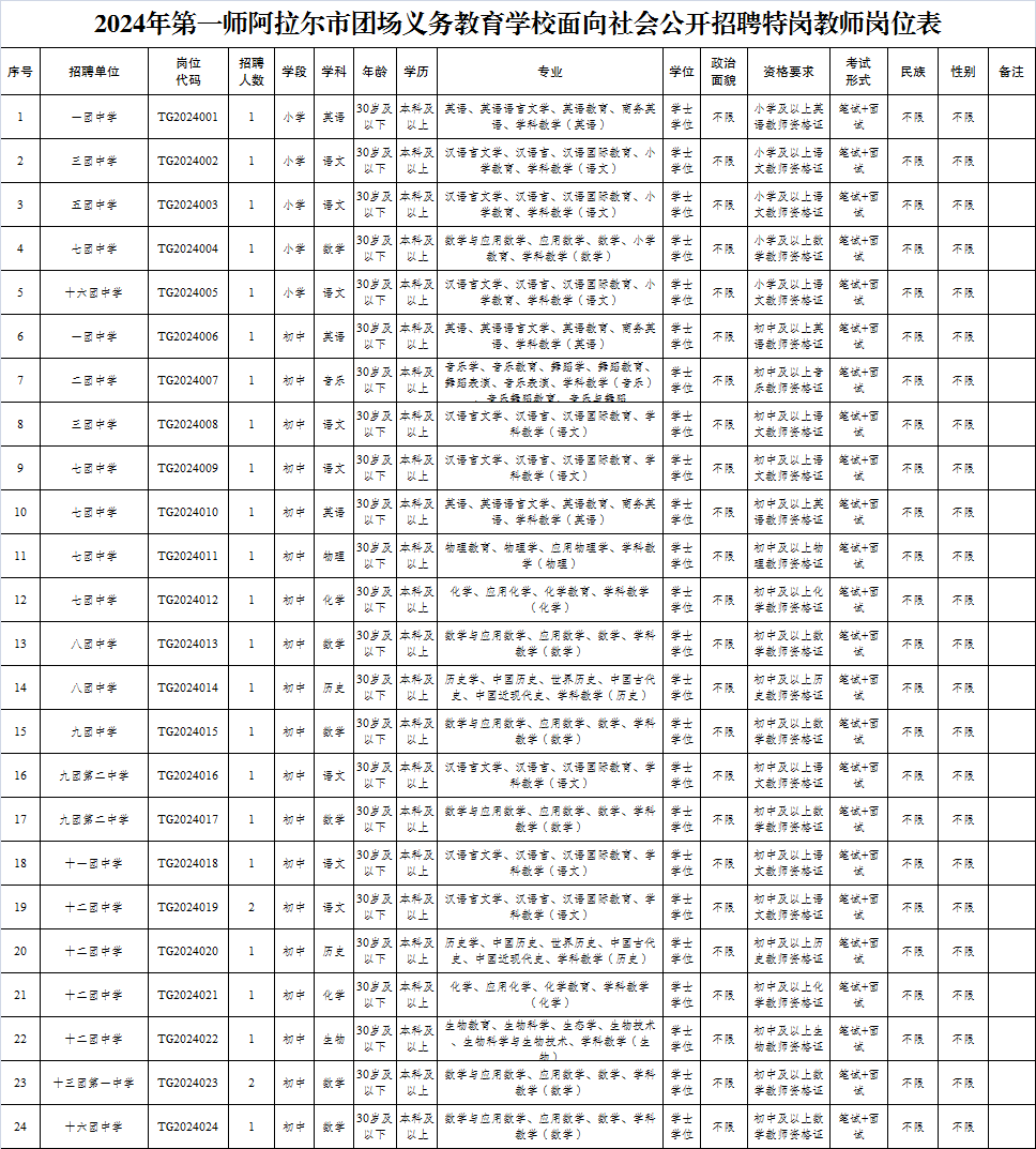 附件:1.2024年第一師阿拉爾市團場義務(wù)教育學(xué)校面向社會公開招聘特崗教師崗位表
