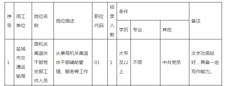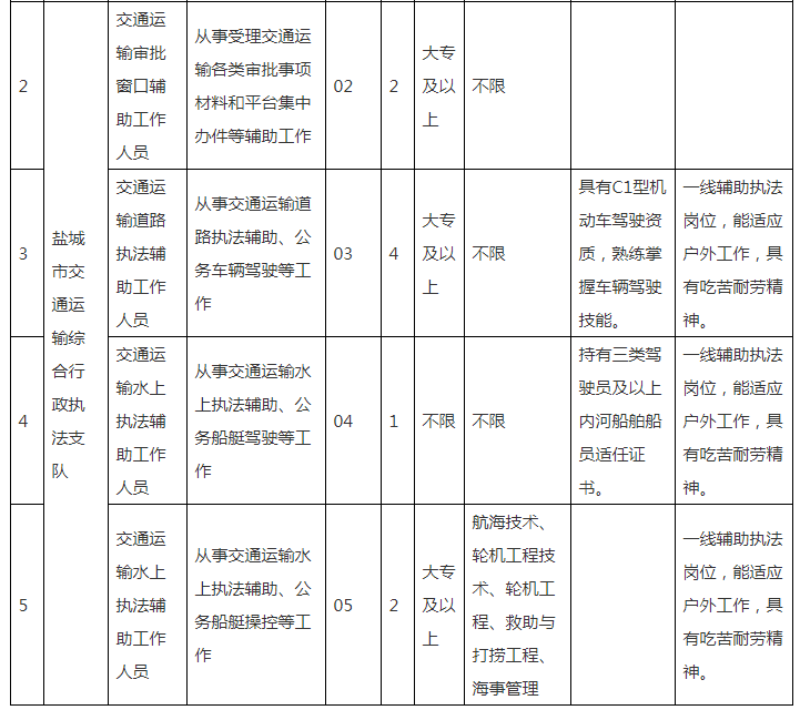 鹽城市交通運輸局及其所屬支隊2024年公開招錄政府購買服務(wù)用工人員崗位表: