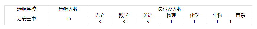 為確保萬安三中2024年秋季開學順利,根據(jù)《關于同意萬安縣2024年秋季中小學教師調配意見的批復》(萬府字〔2024〕95號),按“逢進必考”原則,萬安三中面向全縣初中學校選調教師15名。經(jīng)縣政府研究同意,現(xiàn)將有關事項公告如下: