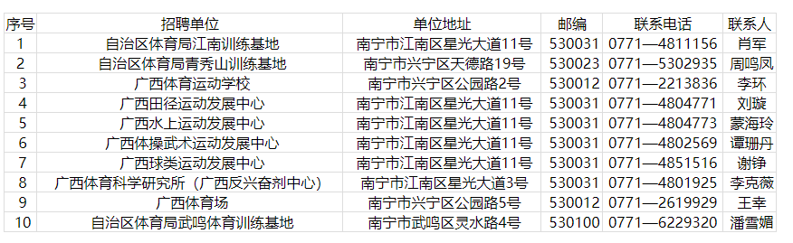 自治區(qū)體育局人事教育處聯(lián)系電話:0771—4822322、4802589。
