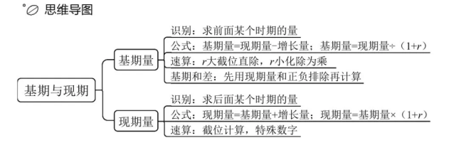 基期量與現(xiàn)期量:資料分析中常涉及兩個(gè)量的比較,作為對比參照的時(shí)期稱為基期,對應(yīng)的量稱為基期量;而相對于基期的時(shí)期稱為現(xiàn)期,所對應(yīng)的量稱為現(xiàn)期量。(時(shí)間靠前的為基期;時(shí)間靠后的為現(xiàn)期)