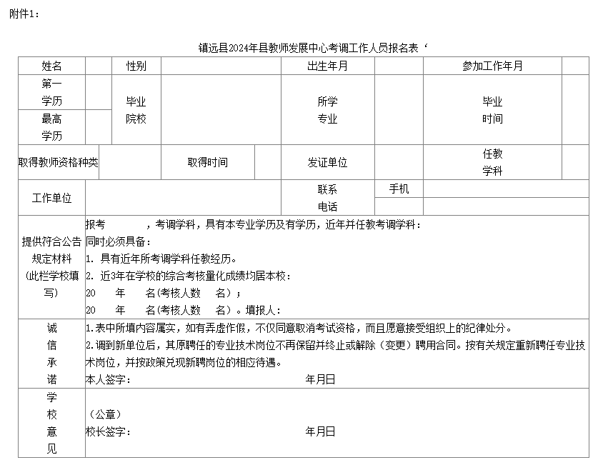 附件:1.鎮(zhèn)遠縣2024年縣教師發(fā)展中心考調(diào)工作人員報名表
