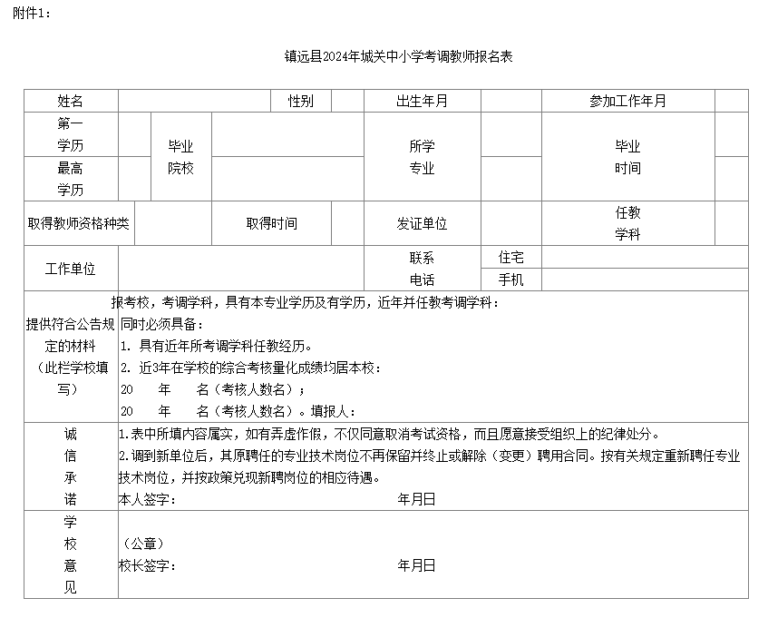 附件:1.鎮(zhèn)遠(yuǎn)縣2024年城區(qū)中小學(xué)考調(diào)教師報(bào)名表