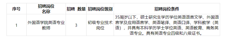 吉林農(nóng)業(yè)大學(xué)根據(jù)工作需要,現(xiàn)面向社會(huì)招聘外語(yǔ)教師3名,具體事宜如下。
