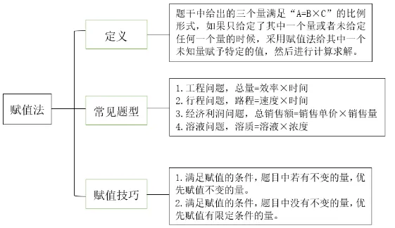 題干中給出的三個量滿足“A=B×C”的比例形式,如果只給定了其中一個量或者未給定任何一個量的時候,使用賦值法給其中一個未知量賦予特定的值,然后進行計算求解。
