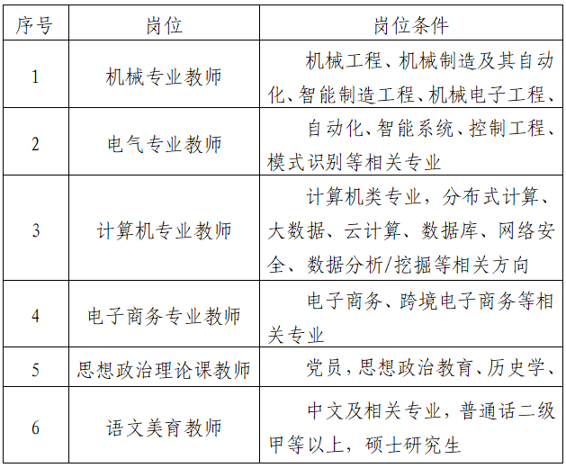 5.專任教師崗具有崗位所需專業(yè)或技能條件,具有高校教學(xué)經(jīng)驗(yàn)、中級以上專業(yè)技術(shù)職務(wù)或具有行業(yè)、企業(yè)工作經(jīng)歷優(yōu)先考慮,條件可適當(dāng)放寬;