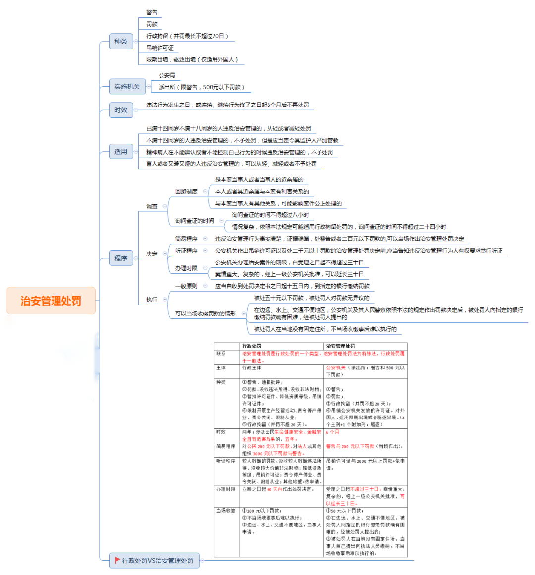 種類 | ①警告、通報批評; ②罰款、沒收違法所得、沒收非法財物; ③暫扣許可證件、降低資質(zhì)等級、吊銷許可證件; ④限制開展生產(chǎn)經(jīng)營活動、責(zé)令停產(chǎn)停 業(yè)、責(zé)令關(guān)閉、限制從業(yè); ⑤行政拘留(并罰不超20天)。 | ①警告 ②罰款; ③行政拘留(并罰不超20天), ④吊銷公安機關(guān)發(fā)放的許可證。對外國人,適用限期出境或者驅(qū)逐出境。(4個主刑+1個附加刑:驅(qū)逐) |