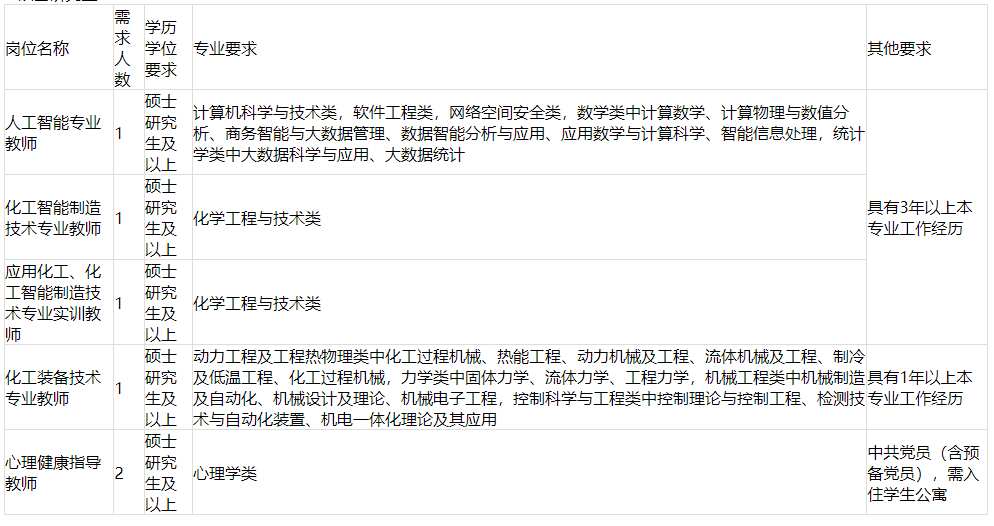 化工智能制造技術(shù)專業(yè)教師 | 1 | 博士研究生 | 化學工程與技術(shù)類,信息與通信工程類,計算機科學與技術(shù)類 |