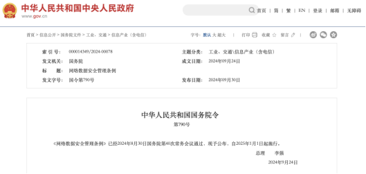 《網(wǎng)絡(luò)數(shù)據(jù)安全管理條例》公布,自2025年1月1日起施行。