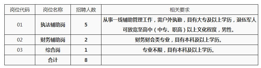 根據(jù)宿豫區(qū)城市管理工作實際需要,經(jīng)研究,決定面向社會公開招聘城市管理輔助工作人員8名?,F(xiàn)將有關(guān)事項公告如下: