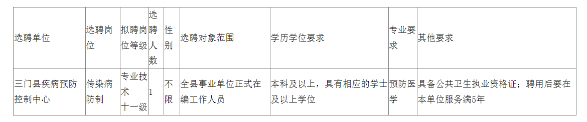 因工作需要,三門縣衛(wèi)生健康局下屬事業(yè)單位面向全縣事業(yè)單位選聘工作人員1名。現(xiàn)將有關(guān)事項(xiàng)公告如下: