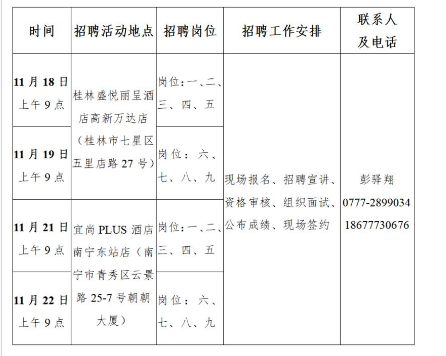 注:此次招聘活動(dòng)在廣西壯族自治區(qū)桂林市和南寧市進(jìn)行線下專場(chǎng)招聘,每個(gè)考點(diǎn)安排兩天時(shí)間分批組織不同崗位的現(xiàn)場(chǎng)招聘和面試,詳見(jiàn)招聘日程安排,每場(chǎng)面試當(dāng)天公布面試成績(jī),各崗位空缺動(dòng)態(tài)情況分別于11月18日、19日、21日晚上在“欽南黨建”微信公眾號(hào)公開發(fā)布,請(qǐng)考生注意關(guān)注報(bào)考崗位變化情況。