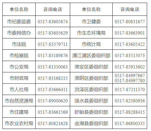 各招錄機關的招考人數(shù)、具體職位、考試類別、資格條件等信息可通過以下網(wǎng)站查詢:淮安黨建網(wǎng)(zzb.huaian.gov.cn)“招錄招聘”專欄、淮安市人力資源和社會保障局門戶網(wǎng)站“人事考試”專欄(http://rsj.huaian.gov.cn/col/4729_463783/index.html)。