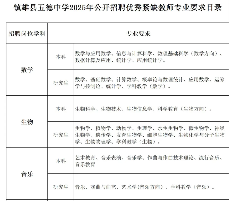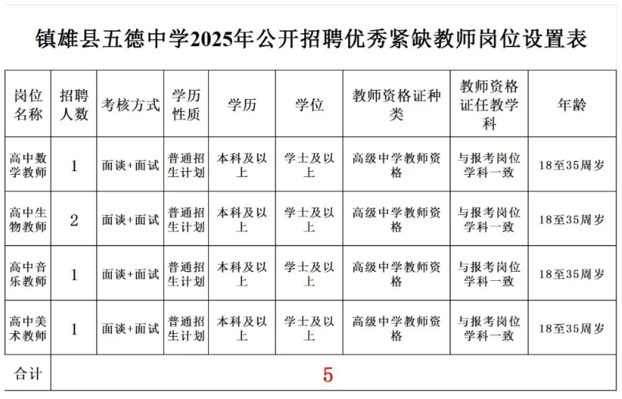 鎮(zhèn)雄縣五德中學2025年優(yōu)秀緊缺教師招聘通告
